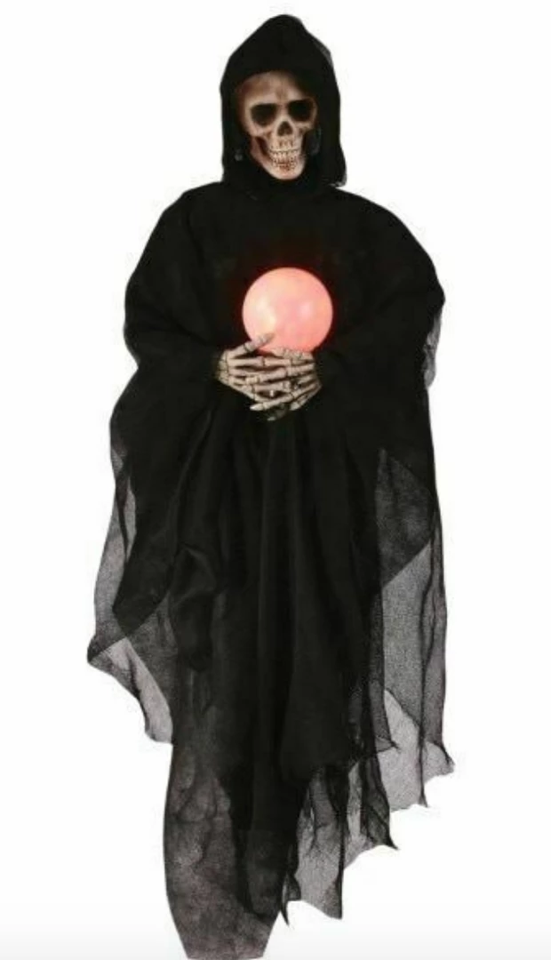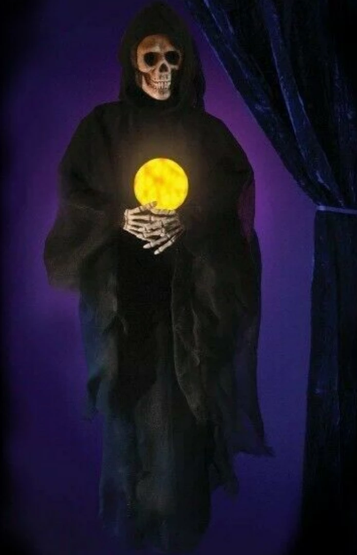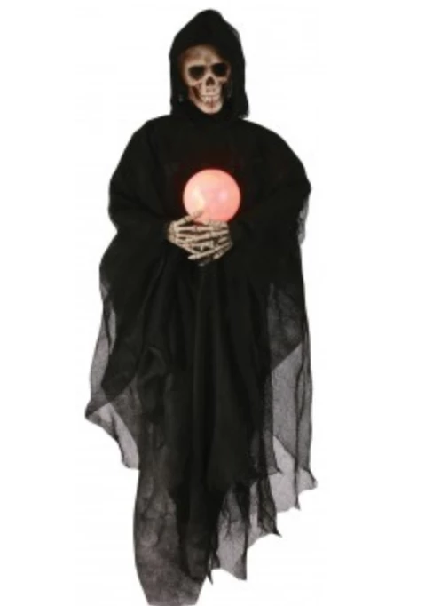 guest and trick-or-treaters gaze into the crystal ball of the grim reaper and