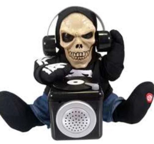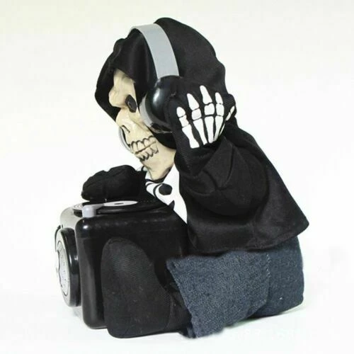 Skeleton DJ features cute black hoodie skeleton wearing earphone, right hand on