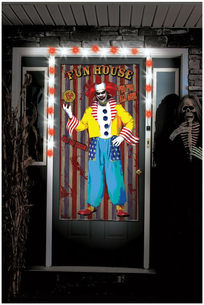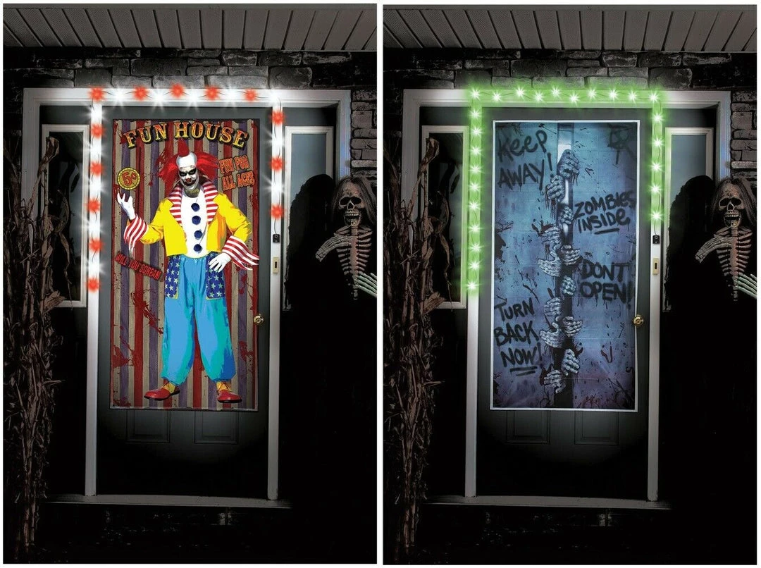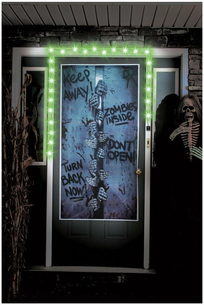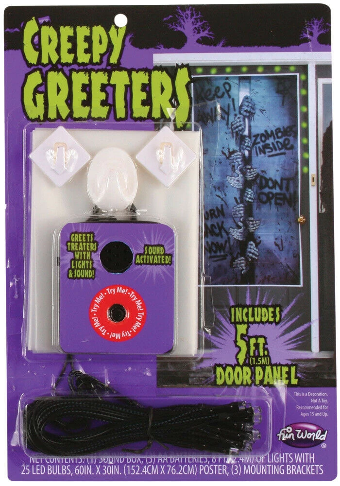 Greet your trick or treaters with this fun door cover that has lights and eerie sound
