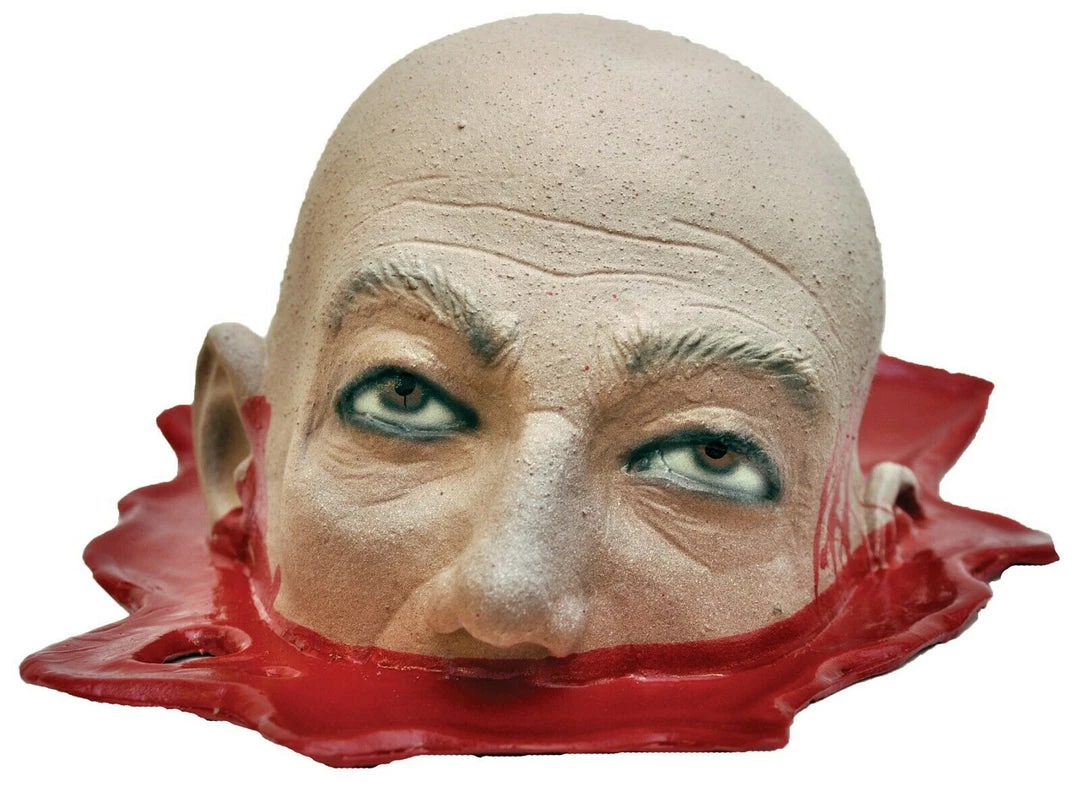 Perfect prop for your table at Halloween! Hollow latex head is cut off right below the nose and sitting in a pool of blood. Hand painted. Approximately 6 inches tall, 9 inches wide and 13 front to back.