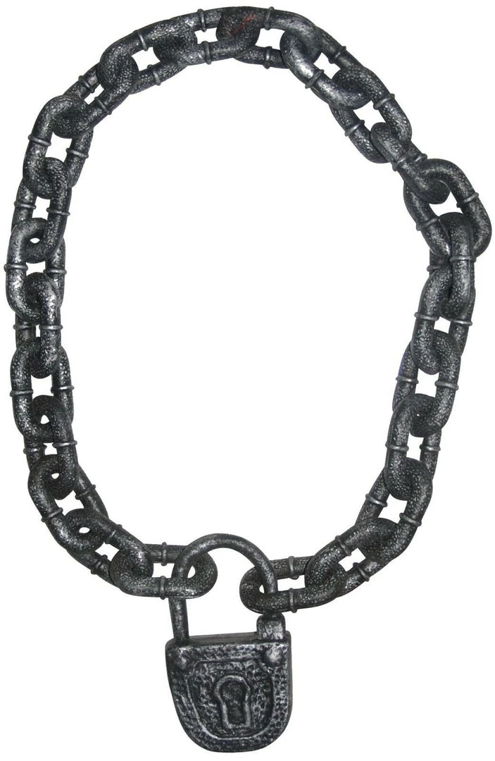 Perfect for a jail scene of for use in a haunted house. Plastic realistic-looking chain with lock. 37 inches x 3 inches