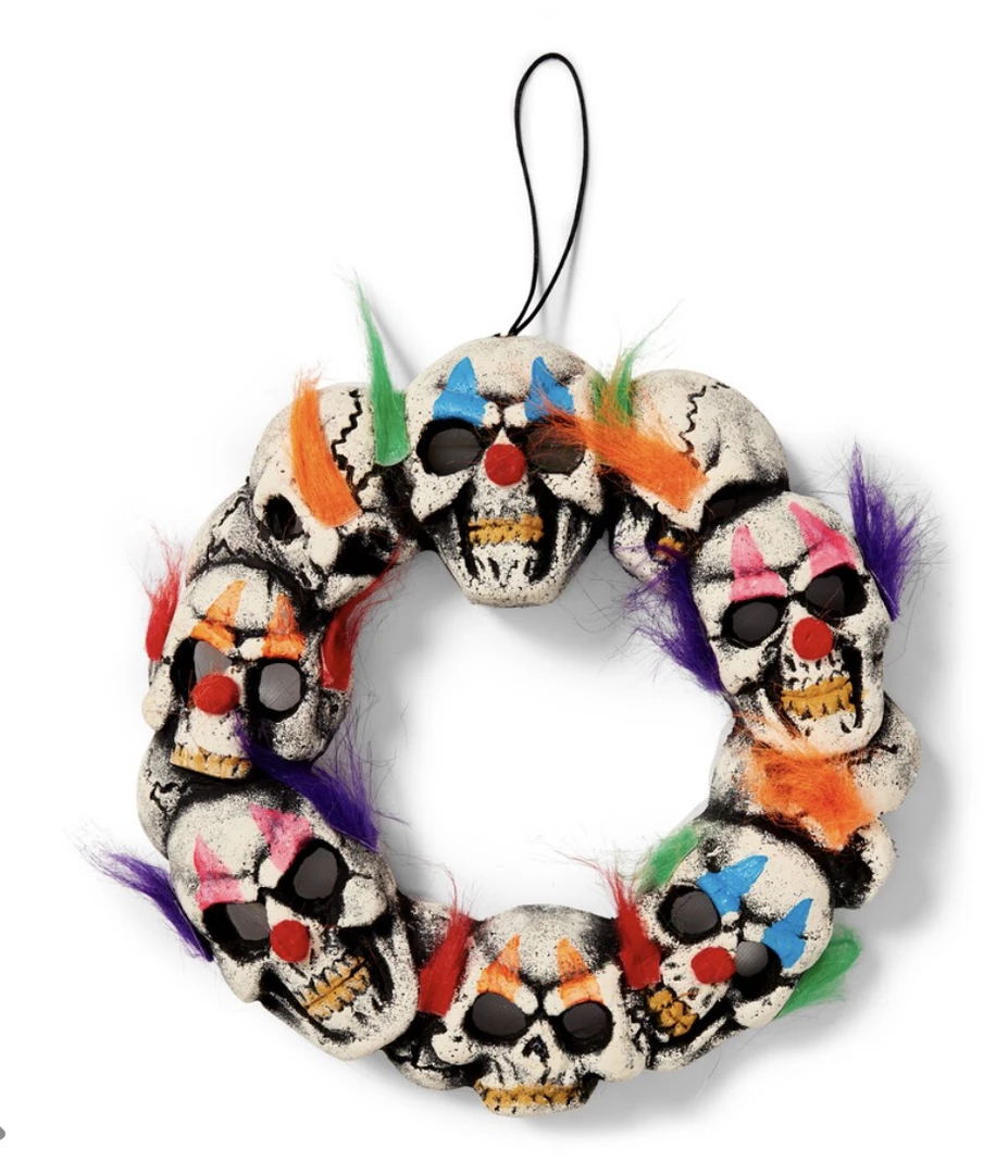 Celebrate spooktober with the Halloween Light Up Clown Wreath. This twisted classic features clown detailing with a light up design and an attached hanging loop.Â