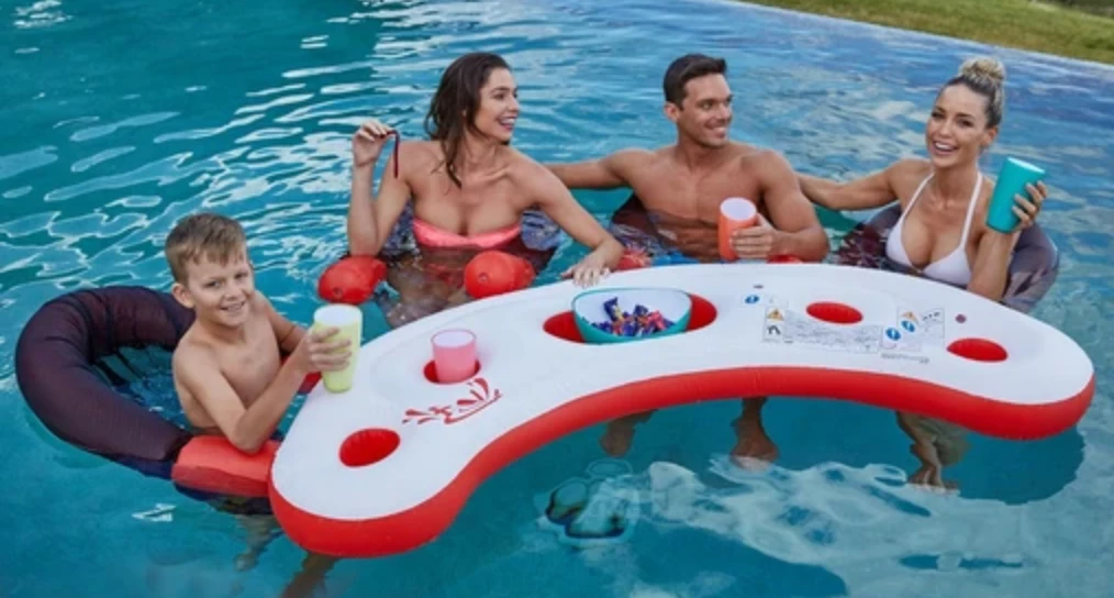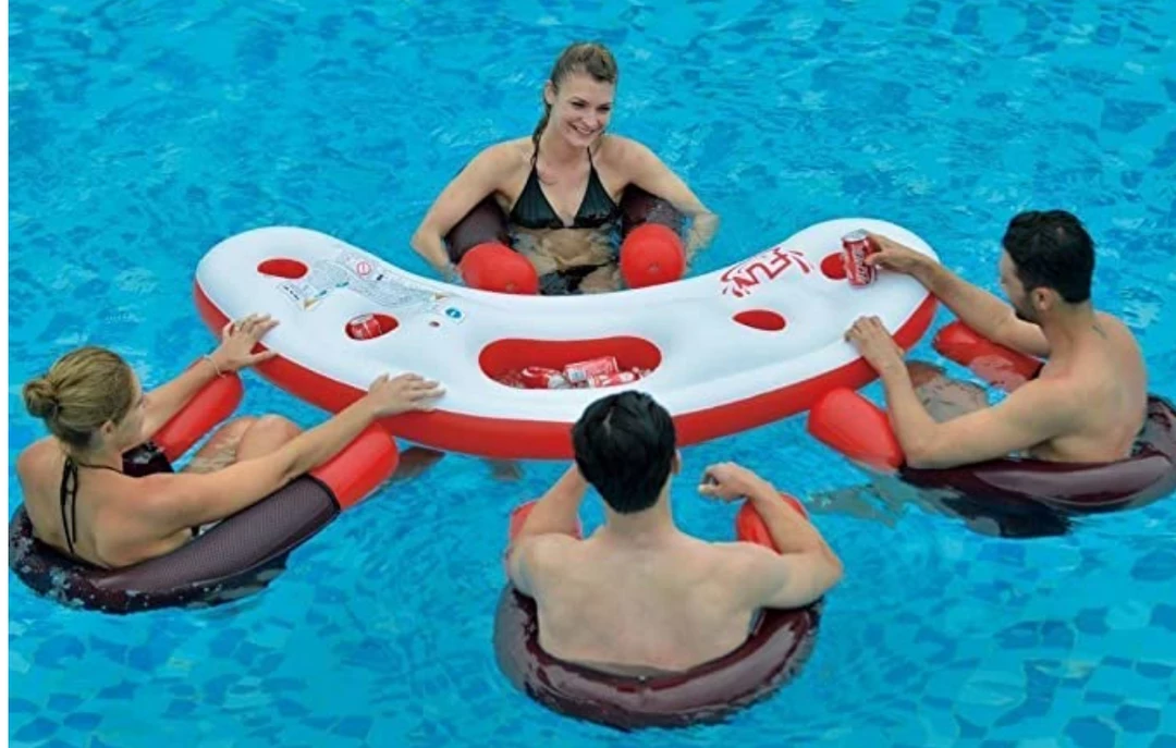 features cup holders and a built-in anchored cooler to keep drinks ice