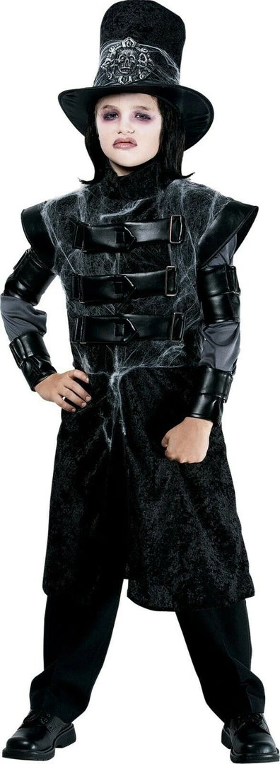 Long sleeve overcoat with spider-web accents, tall hat with emblem on front with spider-web detailing and armbands.